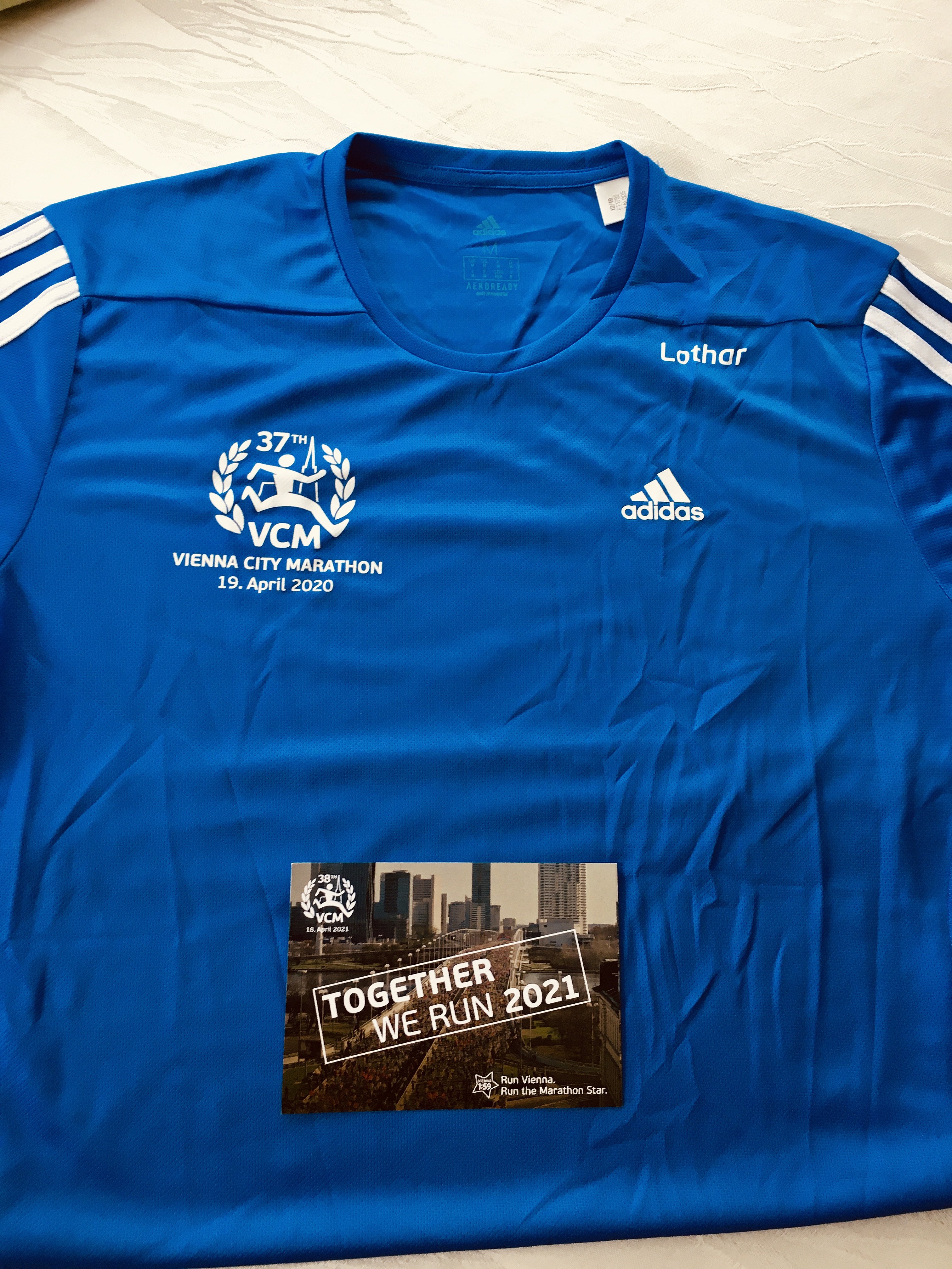 Neugierig wurde es von mir begutachtet. Etwa A 5 groß und es fühlte sich weich an wie ein Kleidungsstück. Sehr erfreut erinnerte ich mich daran, daß die Veranstalter des Wiener Stadt Marathon versprochen hatten, die bestellten T-Shirts der Teilnehmer an der diesjährigen abgesagten Laufveranstaltung per Post zu verschicken. Schnell wurde das Päckchen geöffnet und tatsächlich, ich hielt das blaue Laufshirt mit dem Aufdruck meines Namen und dem Logo des VCM sowie des Datums der abgesagten Veranstaltung in den Händen.